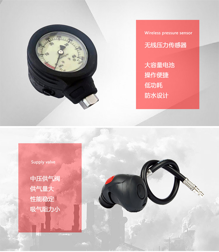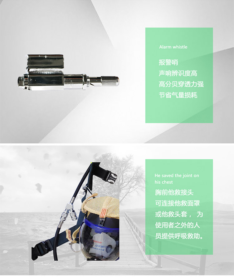 產(chǎn)品特點: 配備無線傳感器式平視顯示裝置,壓力平視顯示裝置可分三段顯示氣瓶內(nèi)的壓力范圍,綠燈常亮代表氣瓶壓力在10~30MPa之間,黃燈常亮代表氣瓶壓力在6~10MPa之間,當(dāng)氣瓶壓力在6 MPa以下時紅燈一直閃亮, 并且開始振動。配備腰間他救接口,為使用者之外的人員提供呼吸救助。